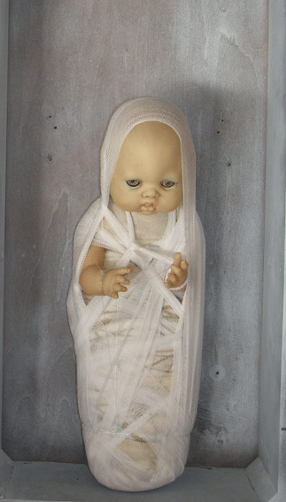 Poupon, tissus & horloge - 34 x 72 x 20 cm (détail) - 2008