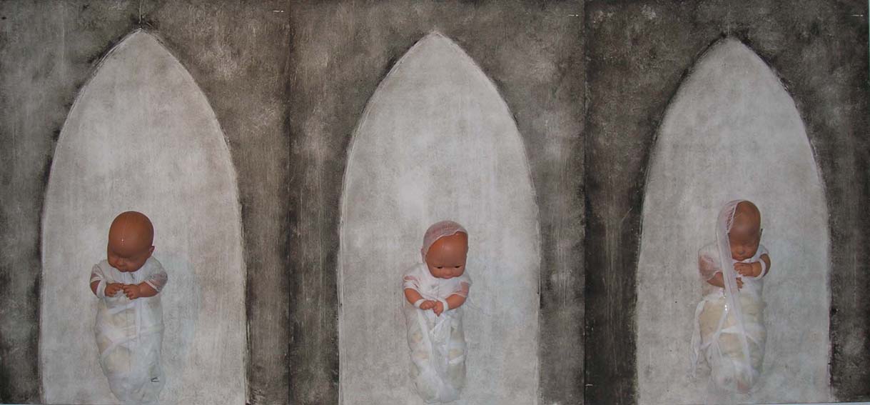 Monotype marouflés sur bois, poupons & tissus - 3x(50x70cm) - 2006