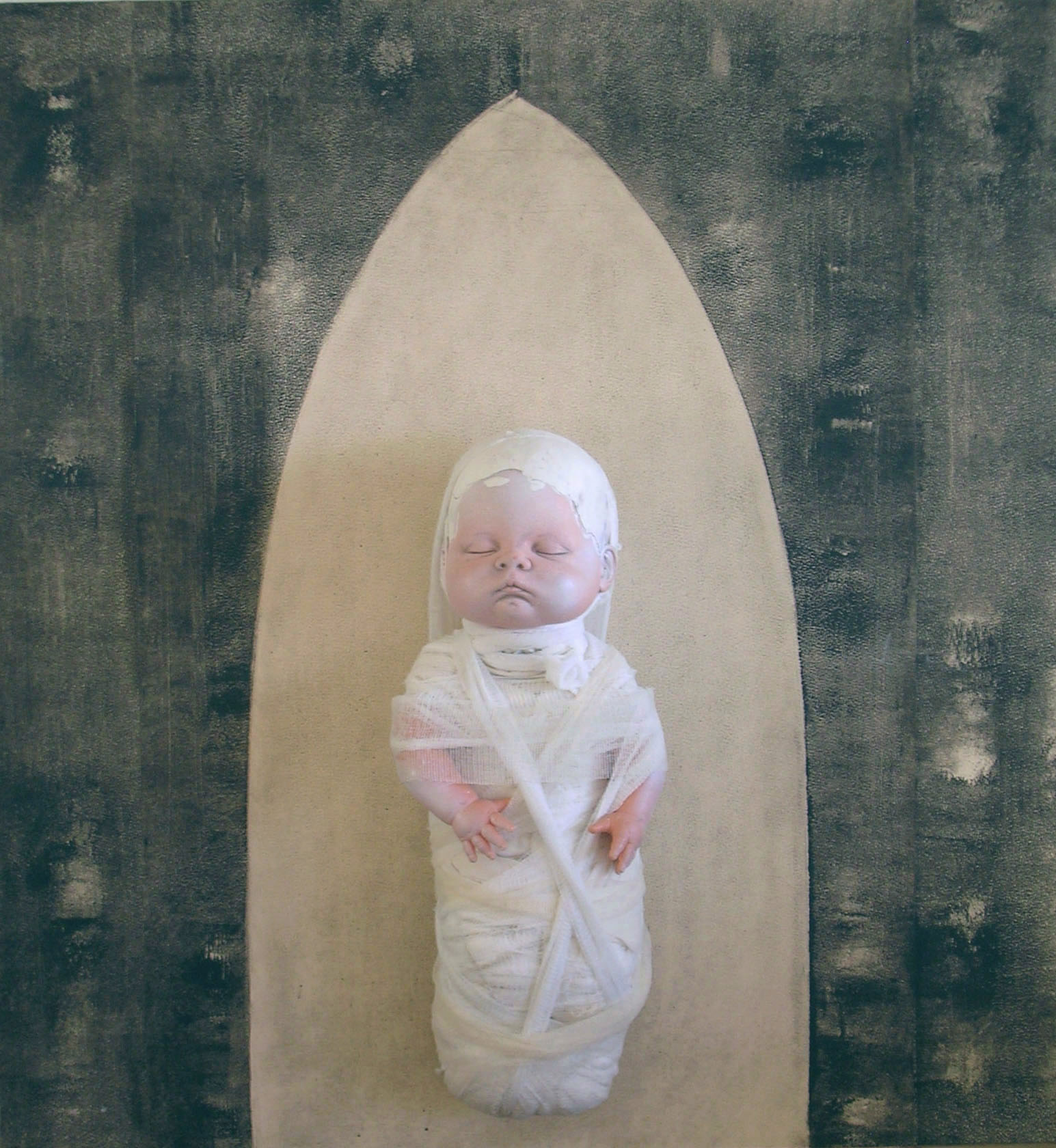 Monotype marouflé sur bois, poupon & tissus - 70 x 75 cm - 2009