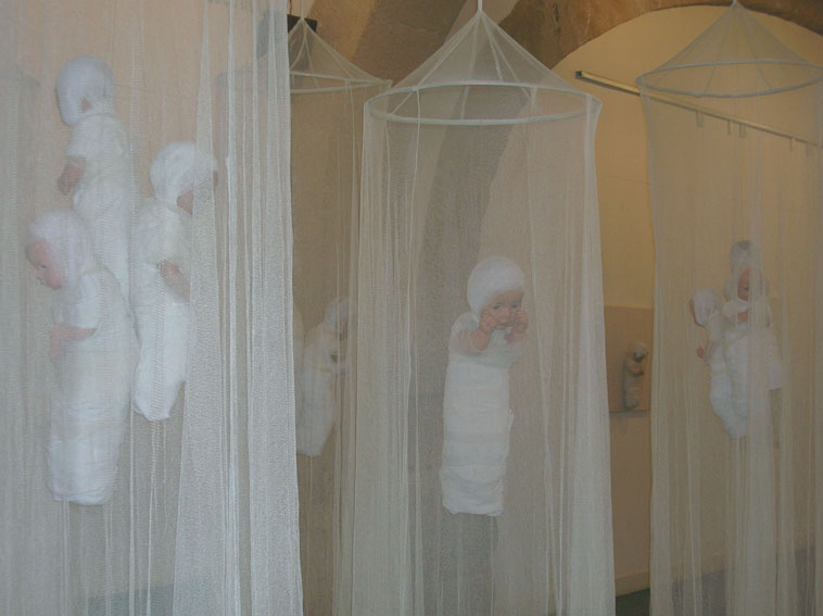 Ensemble de 7 moustiquaires avec poupons - ht environ 210 cm - 2005 (détail)